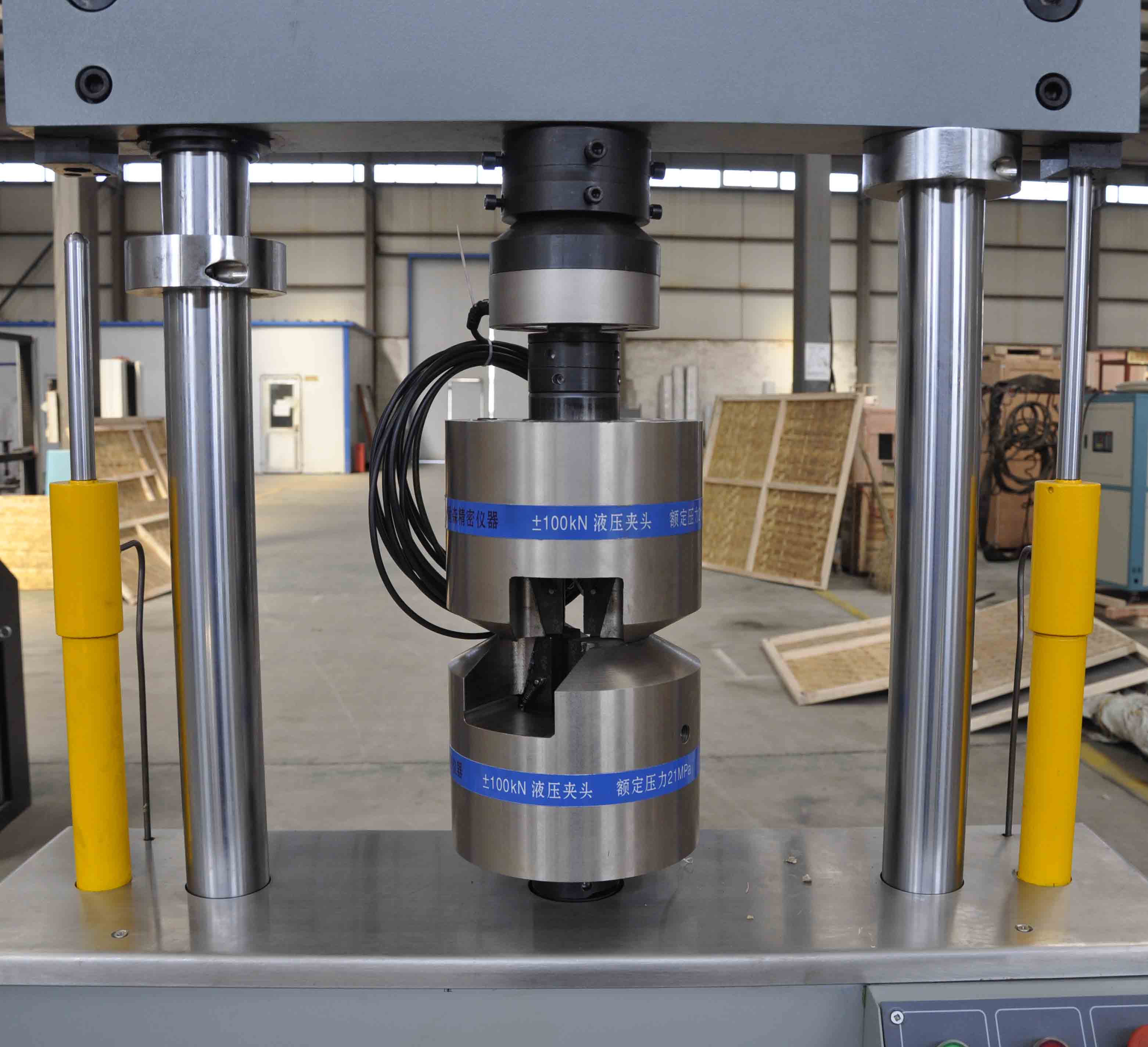 Forced hydraulic pressure chuck is composed of chuck and hydraulic pressure module. The function of hydraulic pressure chuck is clamping specimen, and it is composed of fixture body, clamping piston, jaw and related accessories. Clamping oil cylinder is embedded in the fixture body, adopting bi-directional clamping method, regardless of the change of specimen width, it can always guarantee the concentricity of specimen. Clamping piston and fixture body matches, the fit clearance is less, making the service life of fixture body longer.